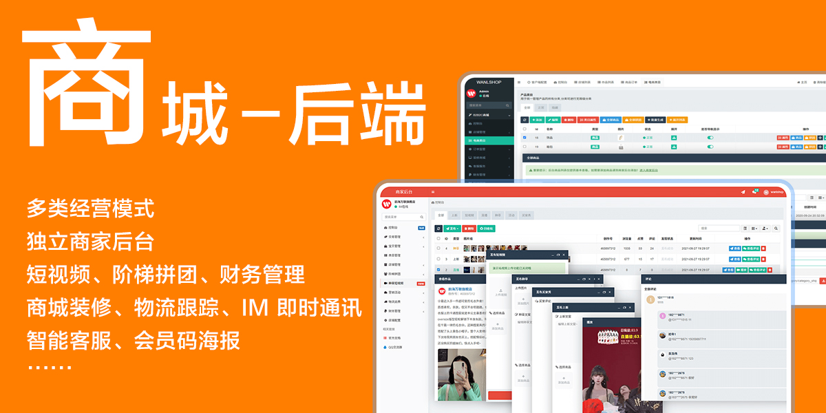 分销商城、营销功能、积分商城、 店铺装修、物流、客服系统